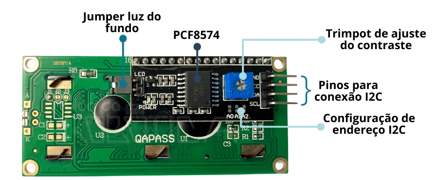 O módulo I2C conta com dois pinos para controle da luz de fundo do visor do display, que se encontram conectados por um jumper, por padrão. Assim, a luz de fundo estará sempre ligada. Você pode remover este jumper para desligar a luz de fundo do display.