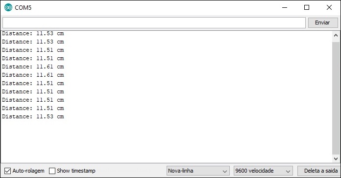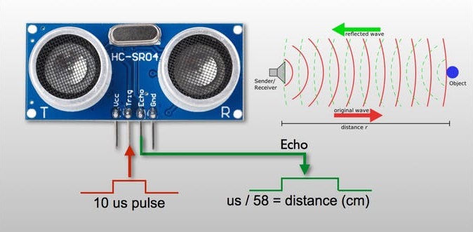 Primeiramente é enviado um pulso de 10µs, indicando o início da transmissão de dados. Depois disso, são enviado 8 pulsos de 40 KHz e o sensor então aguarda o retorno (em nível alto/high), para determinar a distância entre o sensor e o objeto, utilizando a equação Distância = (Tempo echo em nível alto * velocidade do som) /2